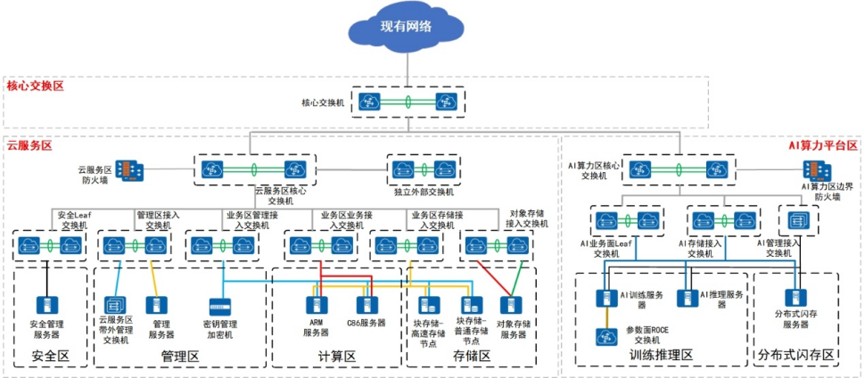 方案設(shè)計(jì):根據(jù)需求分析結(jié)果,設(shè)計(jì)定制化的云數(shù)據(jù)中心基礎(chǔ)設(shè)施建設(shè)方案。涵蓋計(jì)算基礎(chǔ)設(shè)施、存儲(chǔ)基礎(chǔ)設(shè)施、網(wǎng)絡(luò)基礎(chǔ)設(shè)施、安全基礎(chǔ)設(shè)施、電力基礎(chǔ)設(shè)施、制冷基礎(chǔ)設(shè)施、機(jī)房設(shè)施、管理與監(jiān)控系統(tǒng)等各個(gè)子系統(tǒng)的架構(gòu)設(shè)計(jì),確保各部分協(xié)同工作,滿足用戶長期發(fā)展需求。