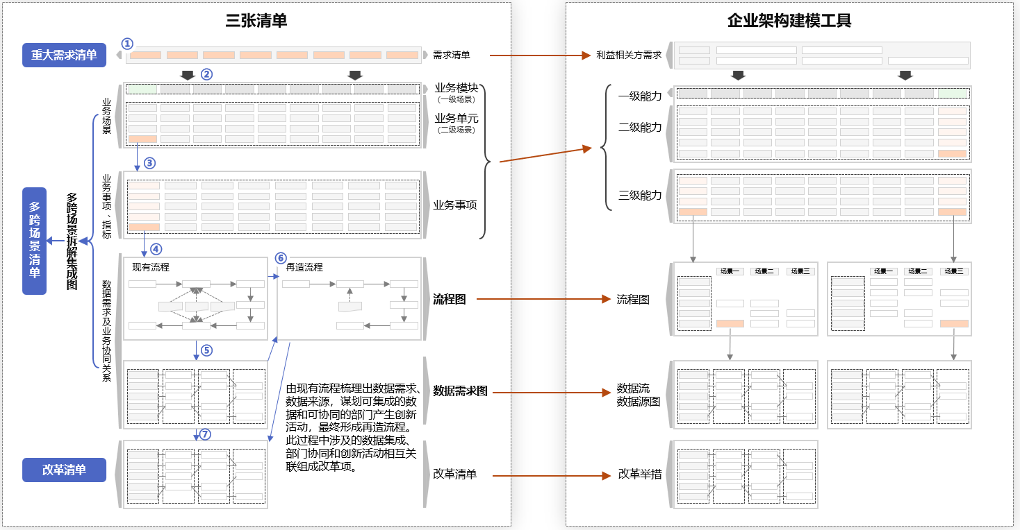 三張清單強調業務協同和數據共享,解決了高頻、多跨場景需求。在利用其強調問題精準定位與精準施策的同時,若與企業架構強調的整體性、全面性、系統性的思想進行融合,易實現以點帶面、點面結合的效果。