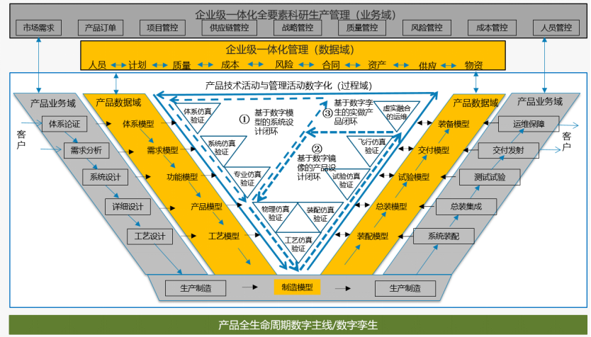 綜上分析,我們認為:新一代PLM系統是運用先進的數字化理念、工具和技術,以相關利益方(含客戶、企業內部、合作伙伴等)協同論證、創建和使用產品資產為基本目的,以產品全生命周期的權威數據源管理為主線,構建產品的數字空間,開展模型數據驅動的規劃論證、研發設計、生產制造、試驗測試、運用保障活動,以及科研生產管理活動,形成客戶需求快速對接、工業部門按需研制、合作伙伴有序配套的體系性協同環境,支撐企業產品全生命周期的業務賦能與流程再造,以及業務的重構和優化,助力企業研制范式變革和業務轉型。
