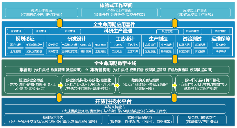 全生命周期數字主線是PLM系統本源功能的固化和深化,效果體現為按照業務流程要求,將正確的數據在正確的時間遞送給正確的消費者,完成從數據提供方到消費者(包含人員、工具軟件、應用系統、設備等)的安全、高效遞送。全周期數字主線包括以下關鍵能力,一是管理全生命周期數據,構成PLM系統的數據基礎。二是全生命周期數據的結構化、參數化和模型化處理。三是通過模型數據的網絡化管理,將數據從“孤立狀態”連接為“連通狀態”,形成經緯相通的數據網絡。四是模型數據的業務賦能,即通過管控流程、技術流程和協同流程,為業務提供數據服務,并與可視化技術和工具深度融合,構成3D為主的直觀、模型驅動的產品研制協同環境。