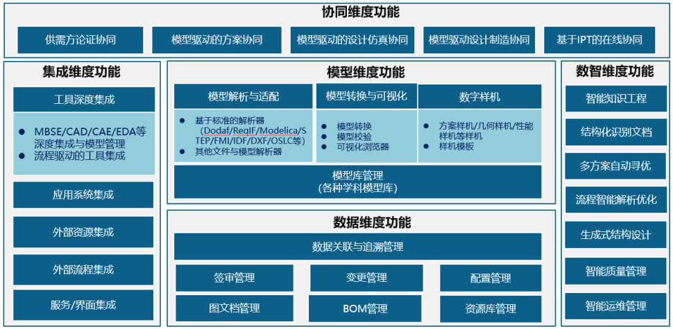 PLM系統能力構成包括集成維度、數據維度、模型維度、協同維度和數智維度的功能集。