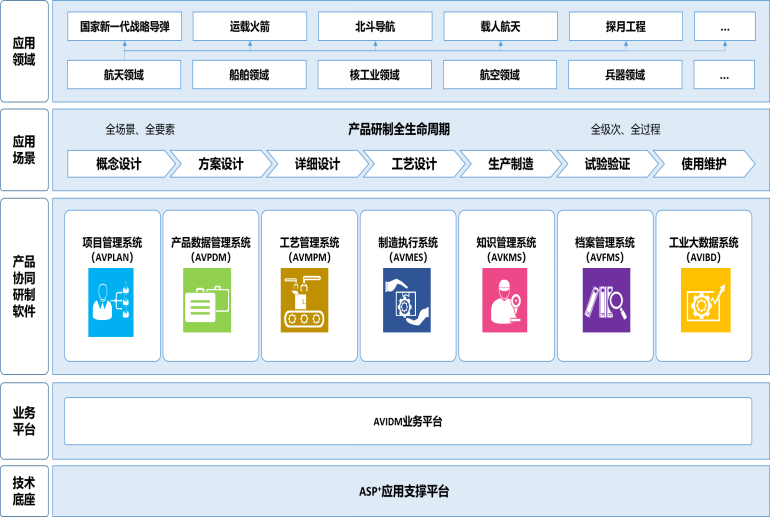 公司憑借在航天及國防軍工等復(fù)雜裝備研制信息化領(lǐng)域30余年的積累和實踐,形成了以AVIDM為品牌的核心工業(yè)軟件產(chǎn)品體系。AVIDM系列軟件主要包括項目管理系統(tǒng) (AVPLAN)、產(chǎn)品數(shù)據(jù)管理系統(tǒng)(AVPDM)、工藝管理系統(tǒng)(AVMPM)、制造執(zhí)行系統(tǒng)(AVMES)、知識管理系統(tǒng)(AVKMS)、數(shù)字檔案管理系統(tǒng)(AVFMS)和工業(yè)大數(shù)據(jù)系統(tǒng)(AVIBD)等子產(chǎn)品。